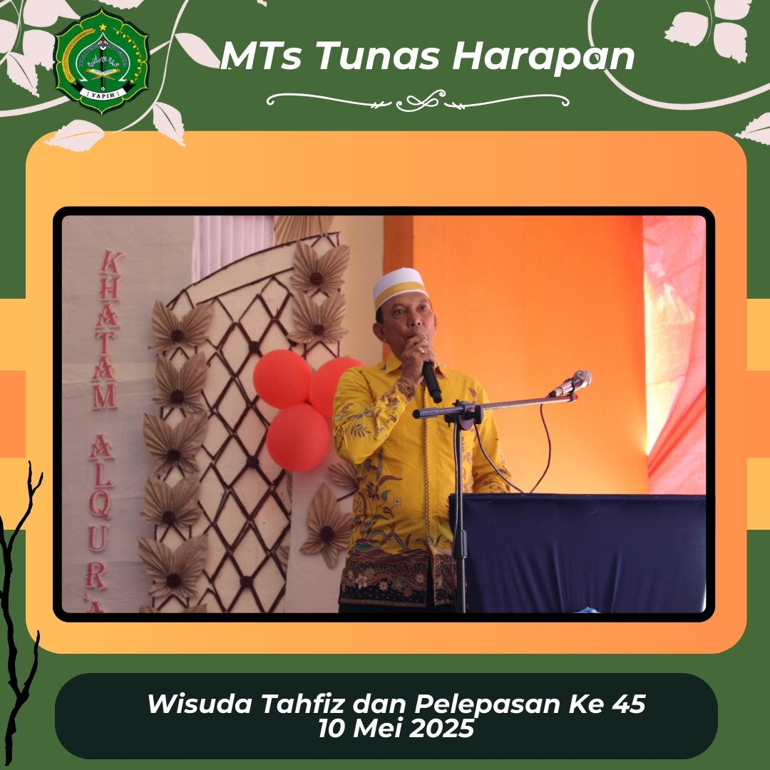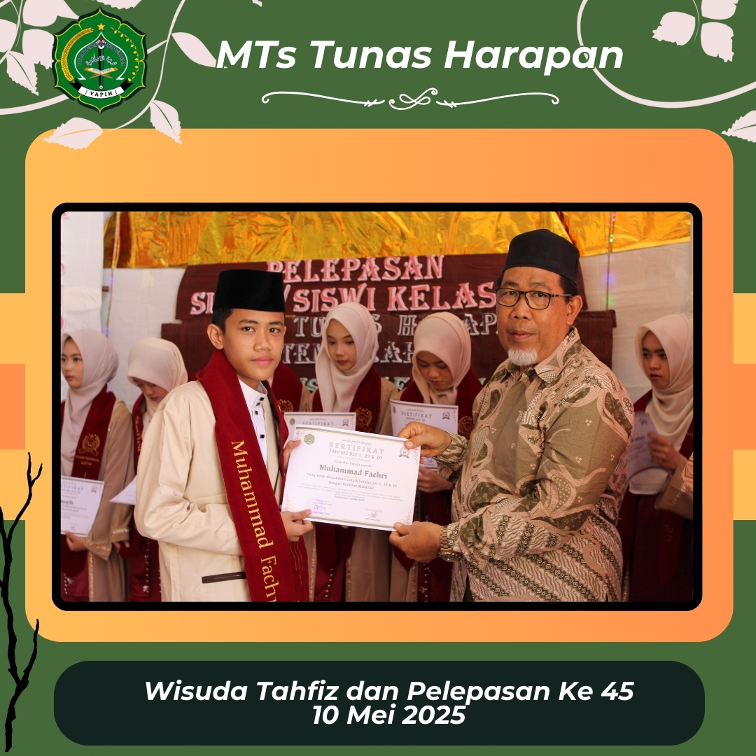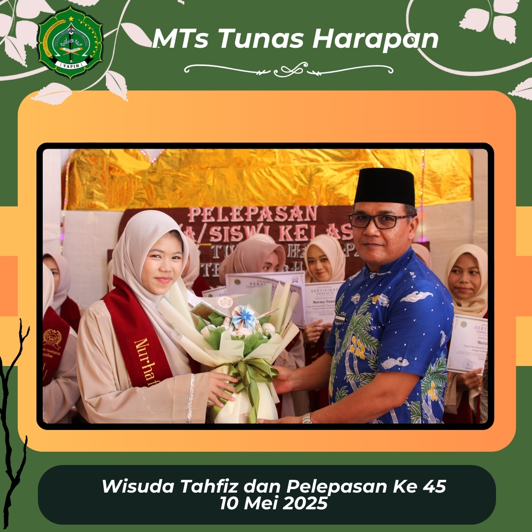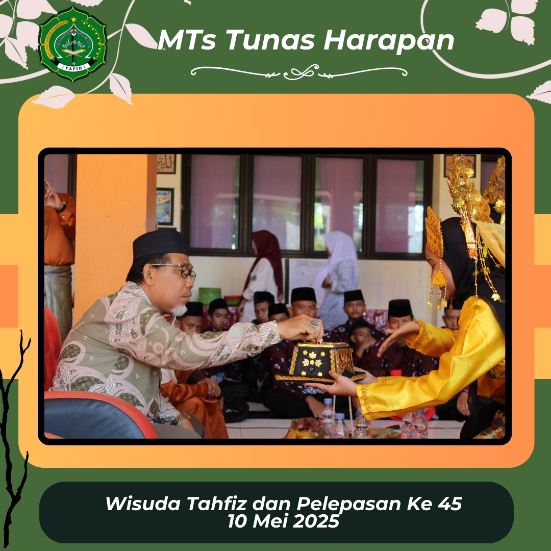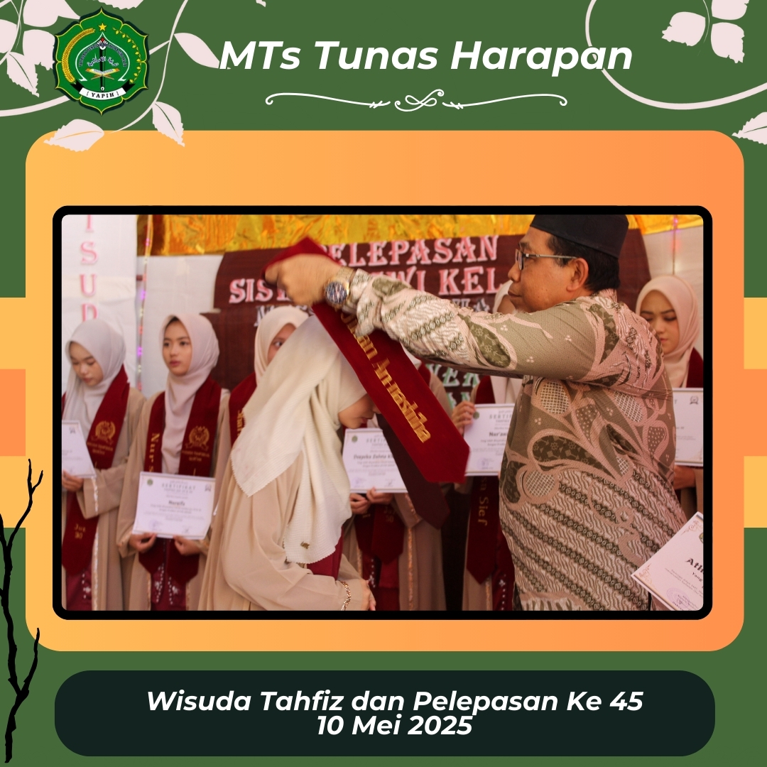 Sabtu, 10 Mei 2025 menjadi hari yang penuh makna bagi keluarga besar MTsS Tunas Harapan. Pada hari tersebut, madrasah menggelar acara Wisuda Tahfidz Al-Qur’an dan Pelepasan Siswa/Siswi Kelas 9 Angkatan ke-45 dengan khidmat, haru, dan penuh kebahagiaan.