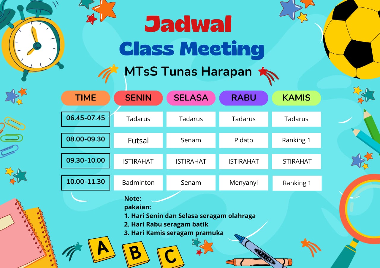 Class Meeting adalah pekan spesial yang berisi berbagai kegiatan dan lomba seru antar kelas yang diadakan oleh Madrasah yang bekerja sama dengan OSIM. Momen ini jadi ajang buat melepas penat setelah selesai ujian sekaligus nunjukkin kekompakan kelas. banyak sekali manfaat dari ajang ini yaitu sarana refreshing & melepas stres, menyalurkan bakat dan minat, mempererat solidaritas dan kekompakan, melatih jiwa sportifitas, dan melatih mental kompetisi yang sehat.